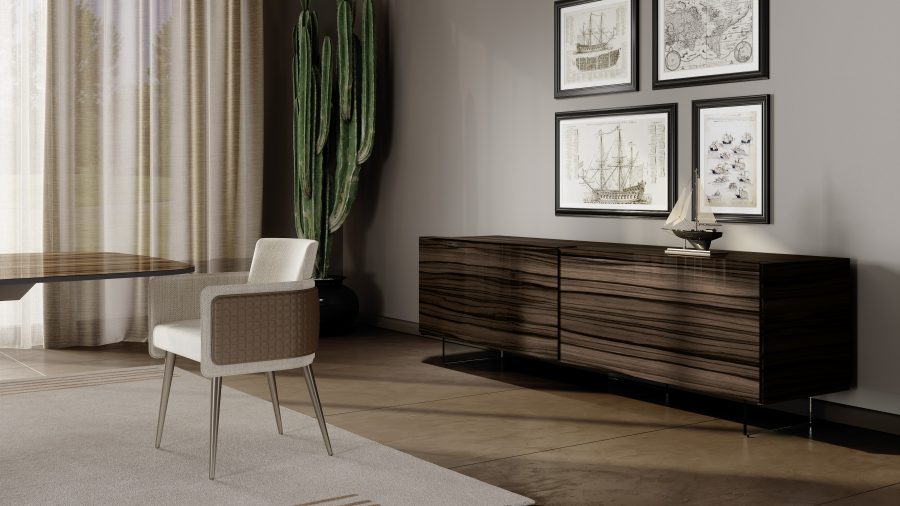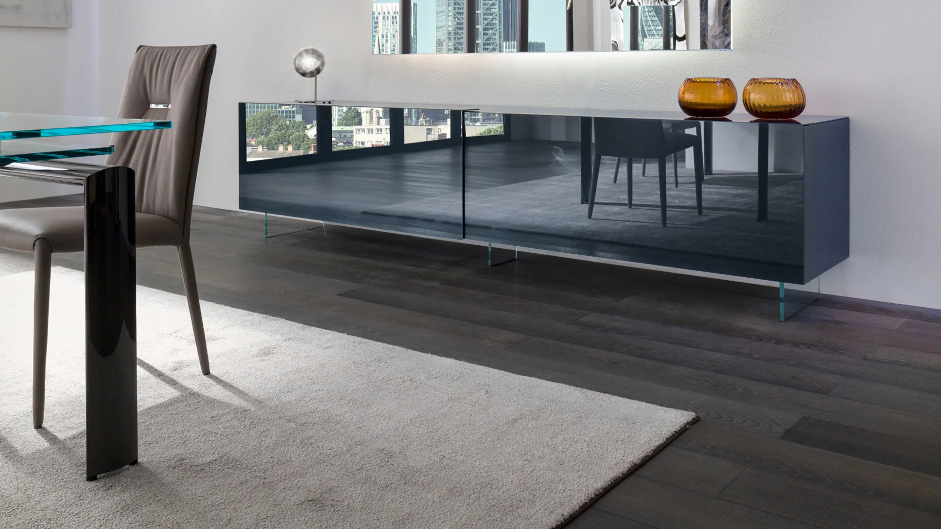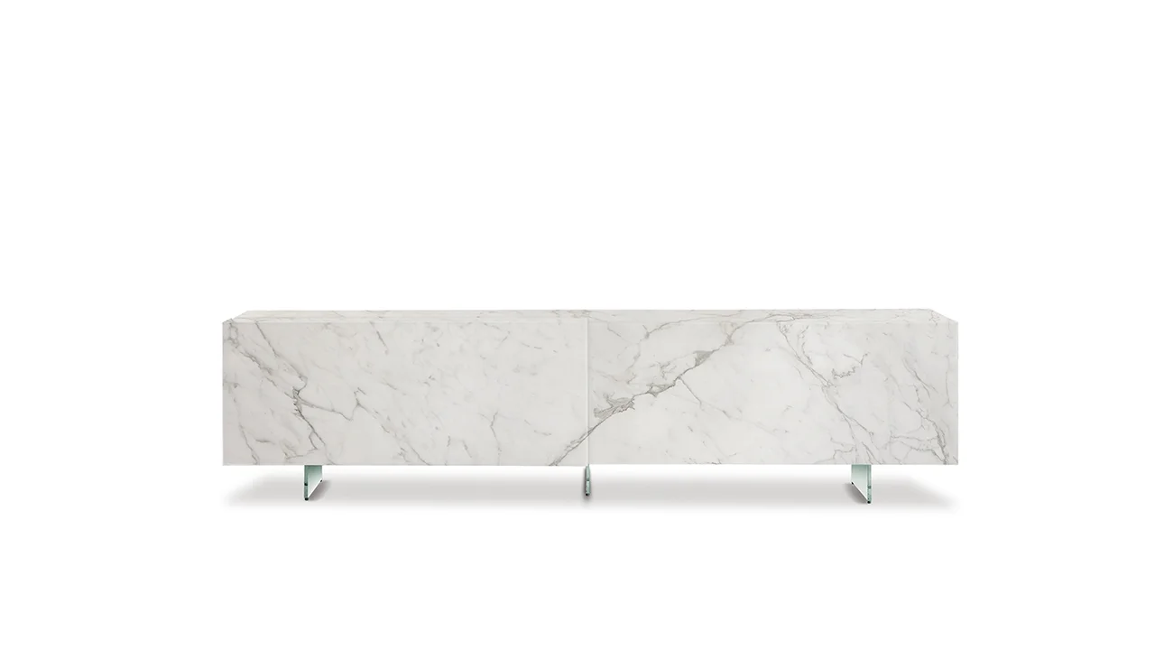 Príborník s 2 posuvnými dverami pokrytými lakovaným alebo leptaným lakovaným sklom. Voliteľné nohy z priehľadného skla alebo z mosadze alebo kovu s titánovou úpravou.