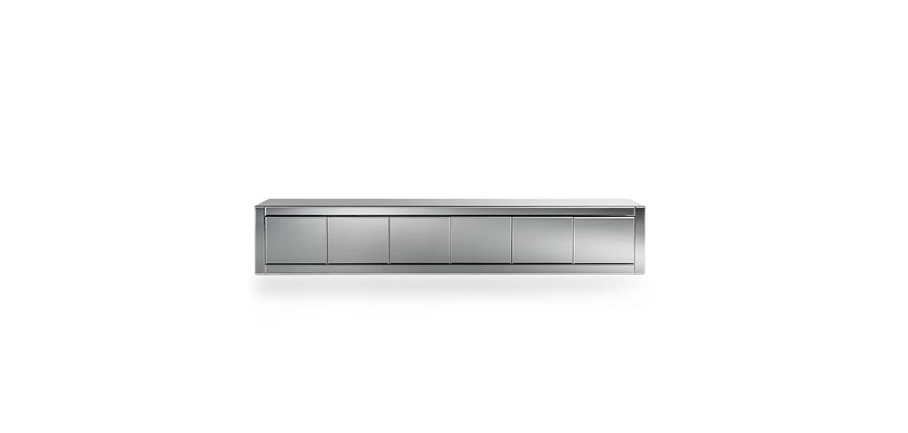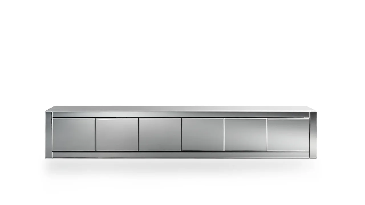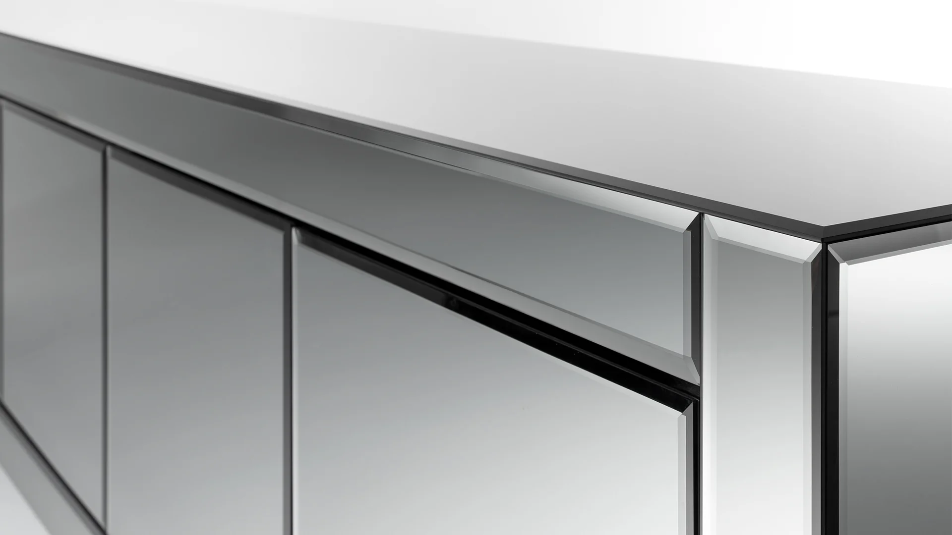 Príborník z lesklého lakovaného dreva pokrytý skoseným lakovaným sklom alebo dymovým zrkadlovým sklom.