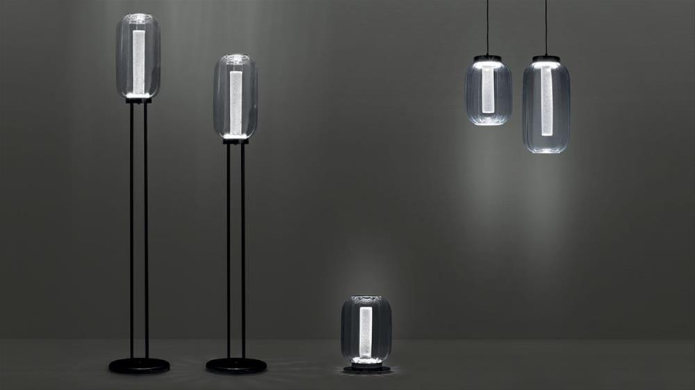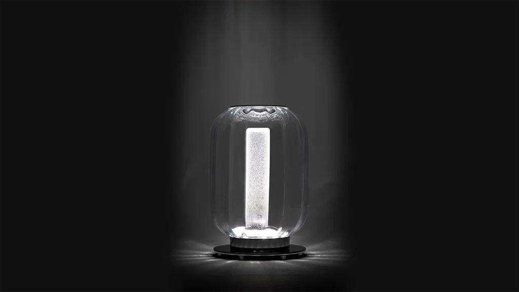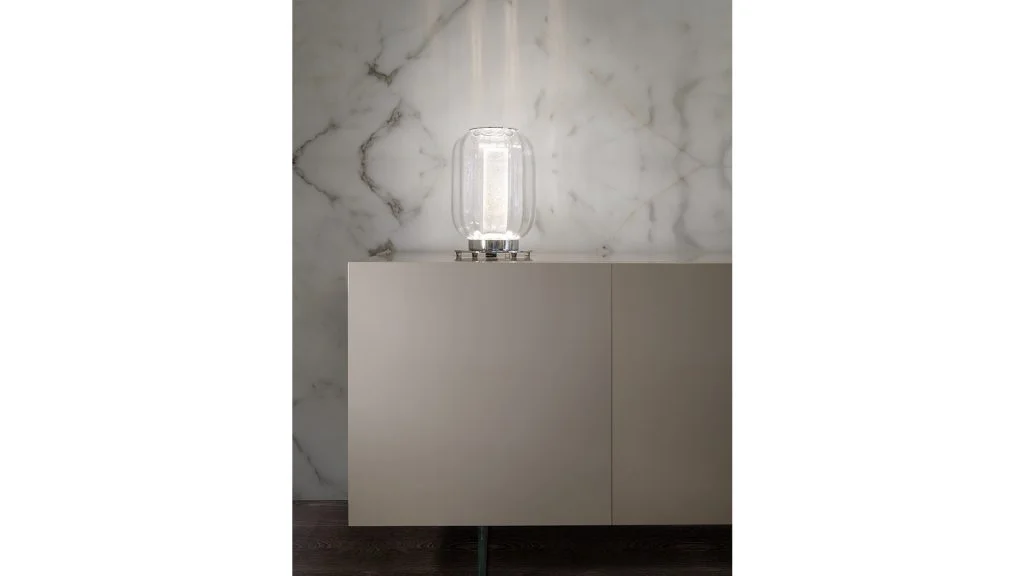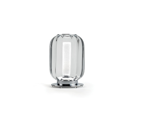 Stolná lampa z umeleckého skla vo farbách: transparentná, akvamarínová, jantárová. Vnútorné tienidlo z povrchového skla Rugiana. Základňa z lešteného chrómovaného kovu. Magnetický sklenený kryt. Led osvetlenie s 3W GUA bodom a 2W pásikom