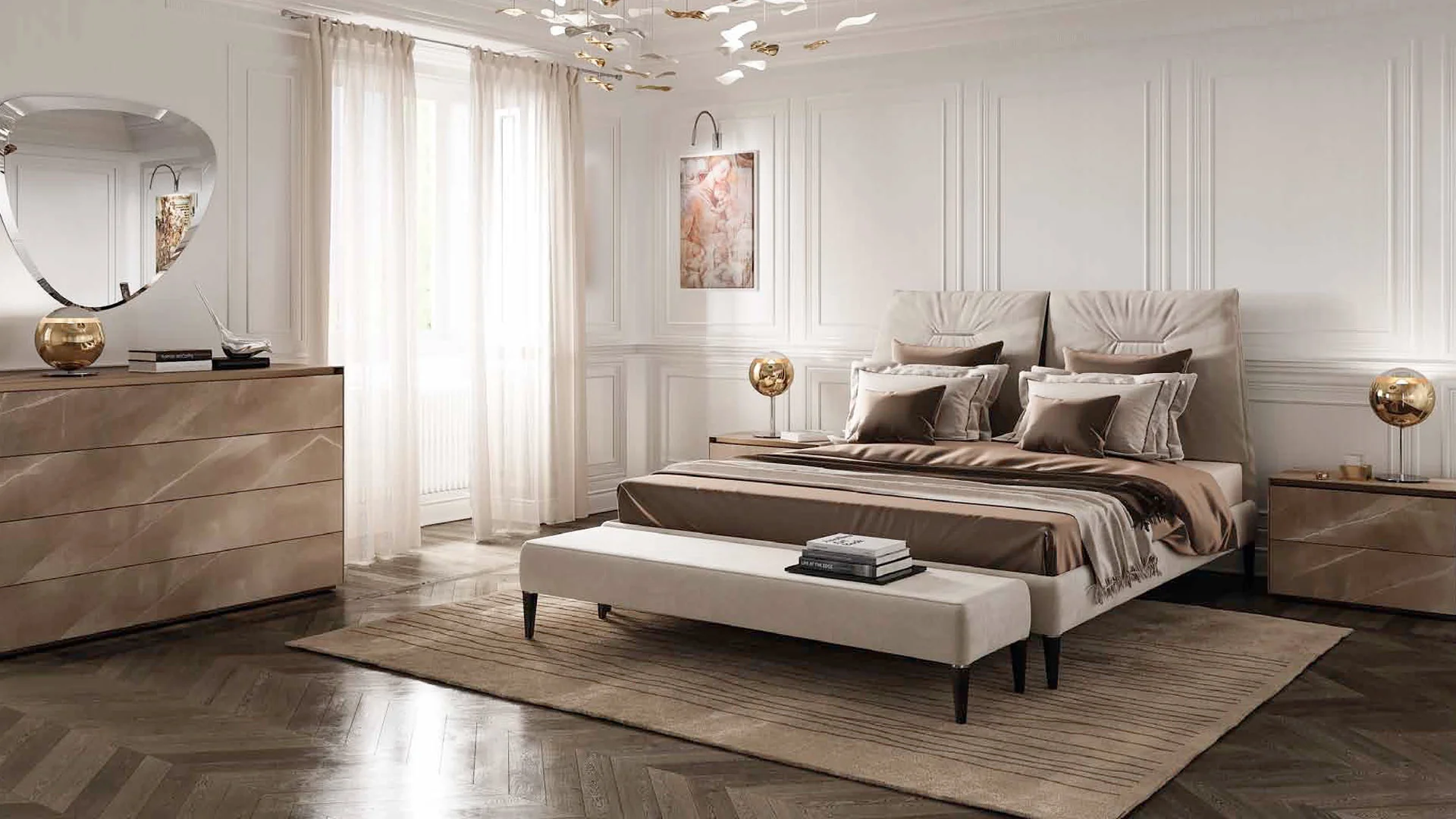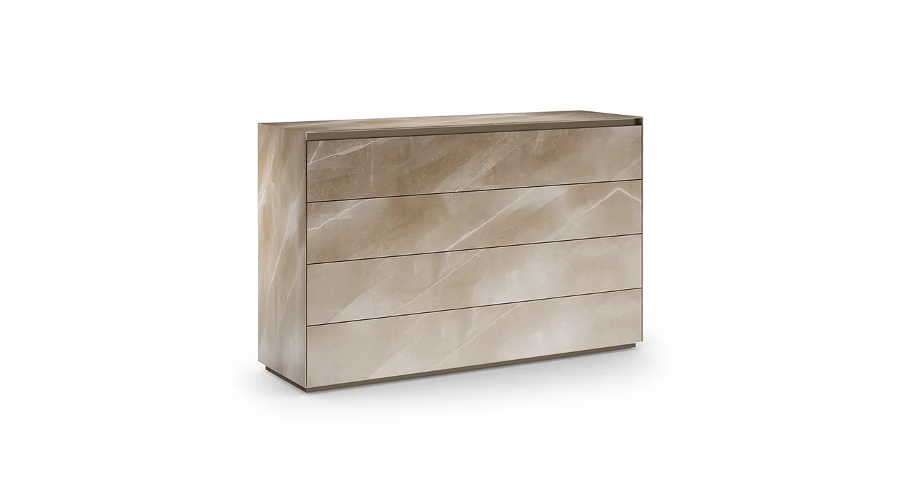 Komoda so zásuvkami s drevenou konštrukciou pokrytá lakovaným alebo leptaným lakovaným sklom, štandardné farby .Profil a podstavec v bronzovom prevedení.