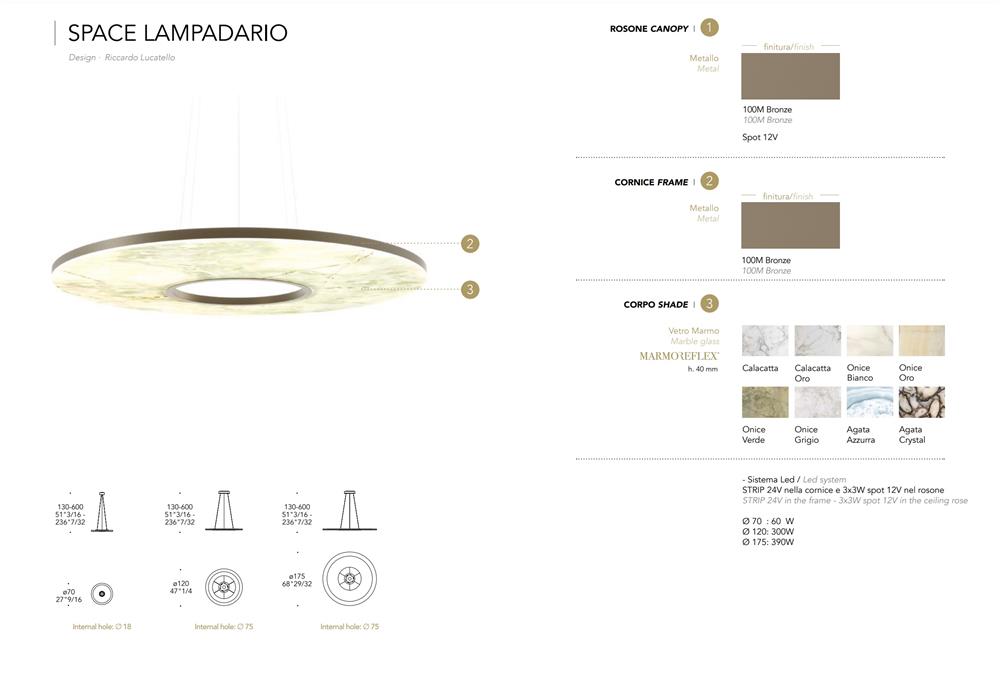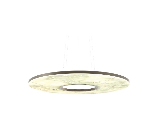 Závesné svietidlo s tienidlom zo skla MarmoReflex. Rám a strieška s povrchovou úpravou Bronze 100M. LED systém Strip 24V v ráme a 3x3W v stropnej ružici.