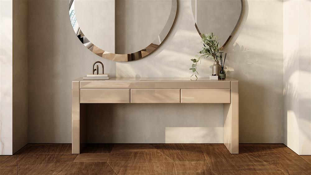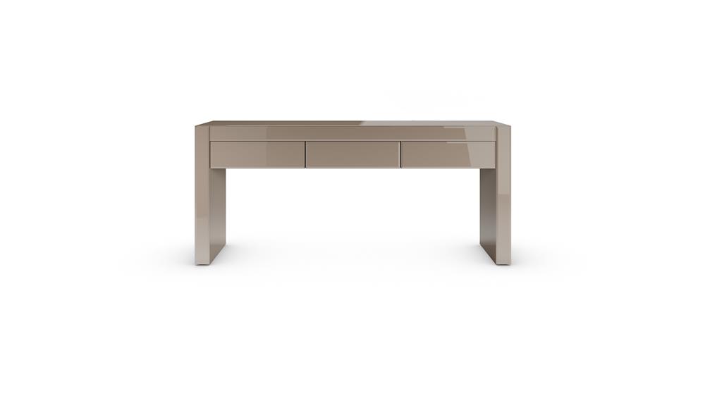 Konzola z lesklého lakovaného dreva. Vrch a predné strany dnu s aplikáciou skoseného lakovaného skla. 3 zásuvky s push-pull otváraním.