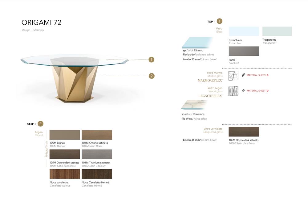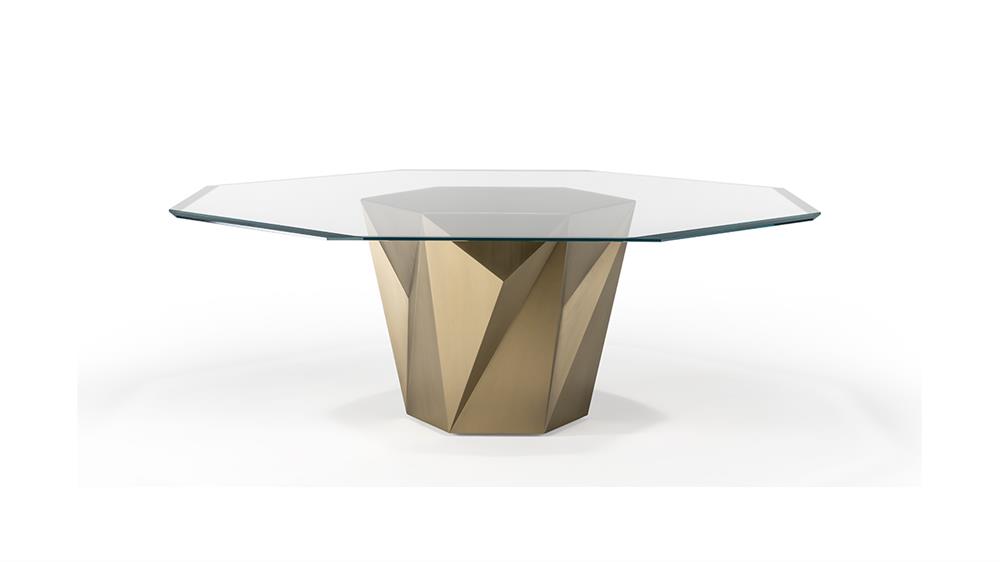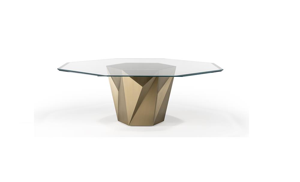 Jedálenský stôl s drevenou podnožou vo farbách bronz (100M), mosadz (104M), tmavá mosadz (105M), titán (101M), meď (107M), zlato (103M). Základňa v Noce Canaletto, Canaletto Henné.