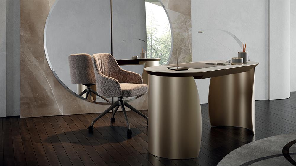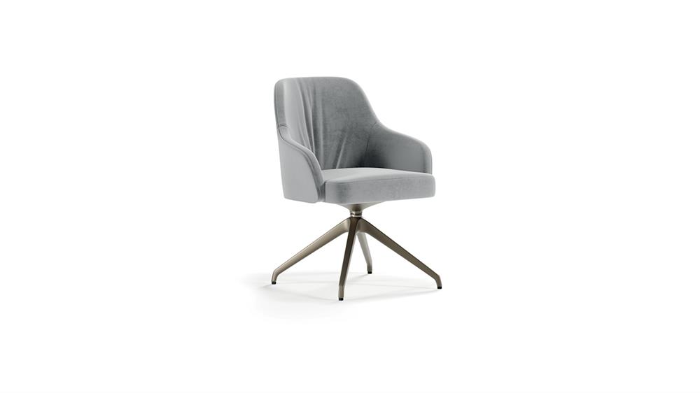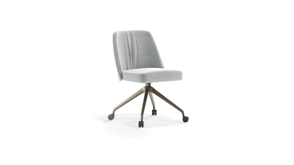 Stolička s drevenou konštrukciou a čalúneným sedadlom a operadlom. K dispozícii s dvoma typmi podstavcov: podstavec s pumpičkou na nastavenie výšky a s kolieskami a podstavec s nohami. Obe základne sú dostupné v leštenom hliníku, bronzovom prevedení alebo v matnom saténovom prevedení.