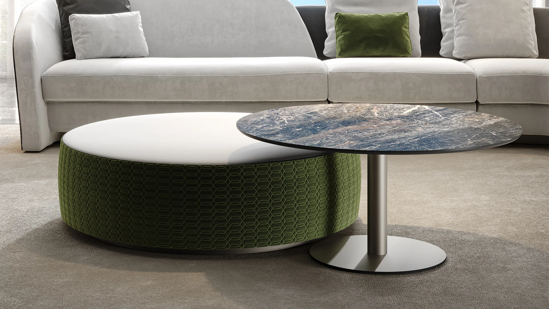 Bočné a nízke stolíky s doskami z materiálu MarmoReflex alebo LegnoReflex. Kovová základňa v bronzovom prevedení alebo v saténových kovových povrchoch.