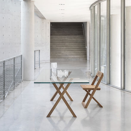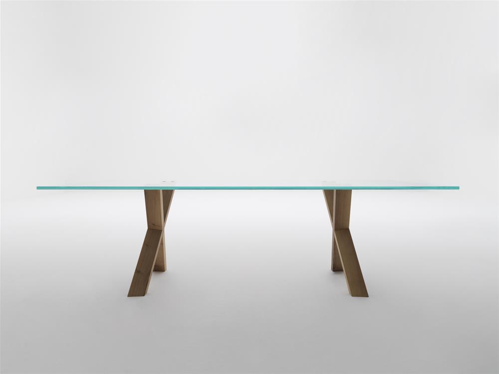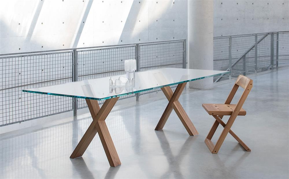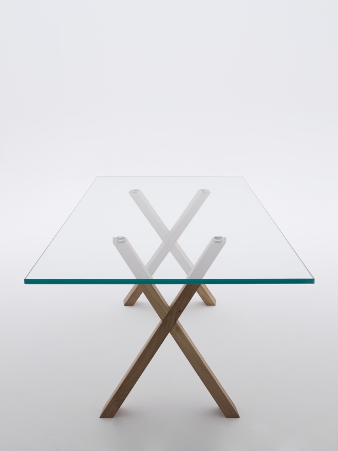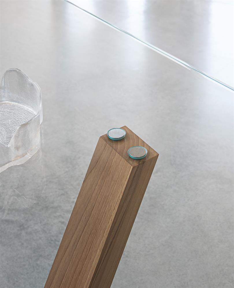 Stôl s doskou z priehľadného skla s hrúbkou 19 mm má tiež podnož z orechového dreva a nohy, ktoré sa navzájom krížia a vytvárajú tvar X.
